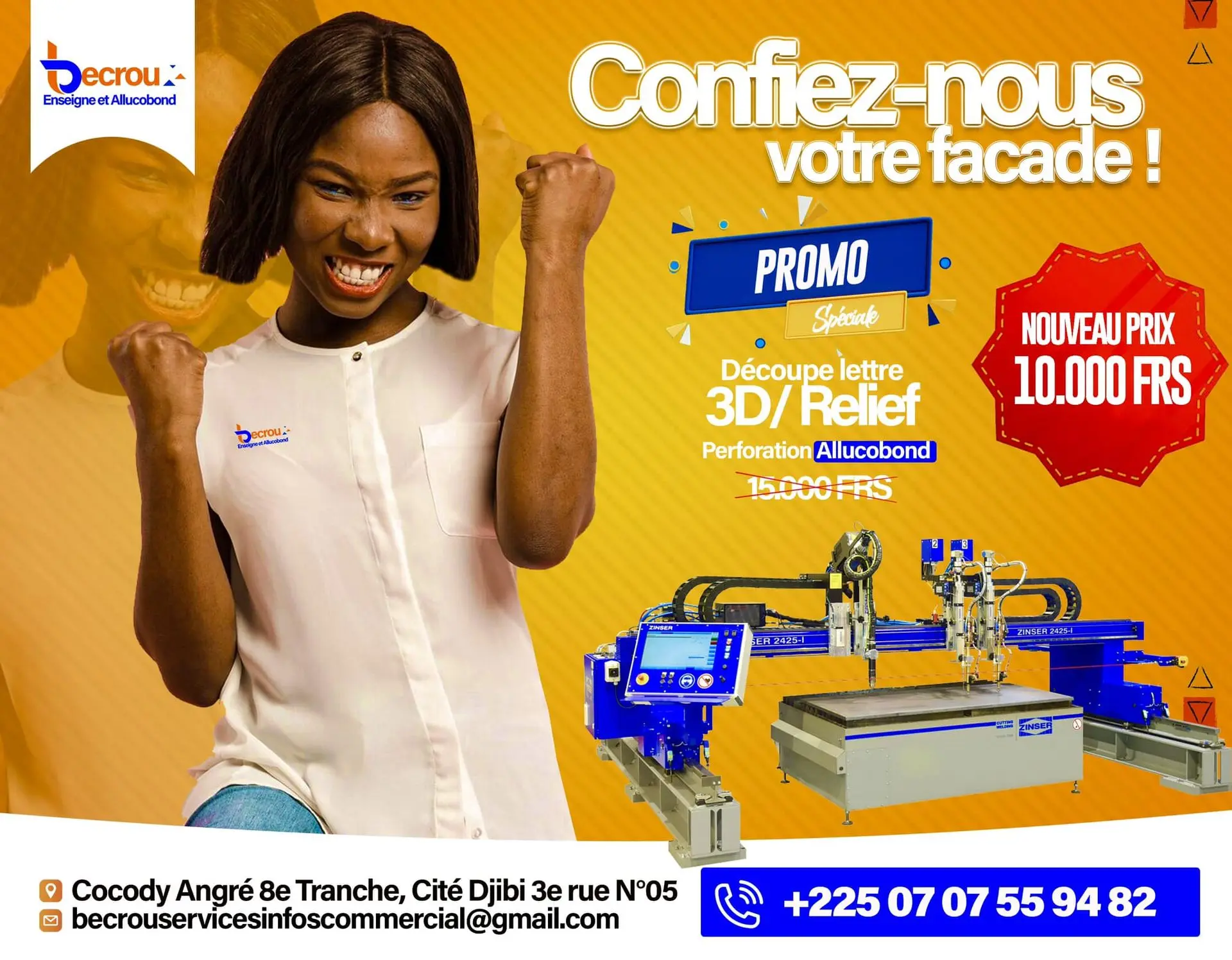 De la conception à la livraison, tout est réalisé sur place avec rigueur et professionnalisme. Nous offrons des prestations rapides et fiables, adaptées aux besoins des entreprises et particuliers d’Abidjan.